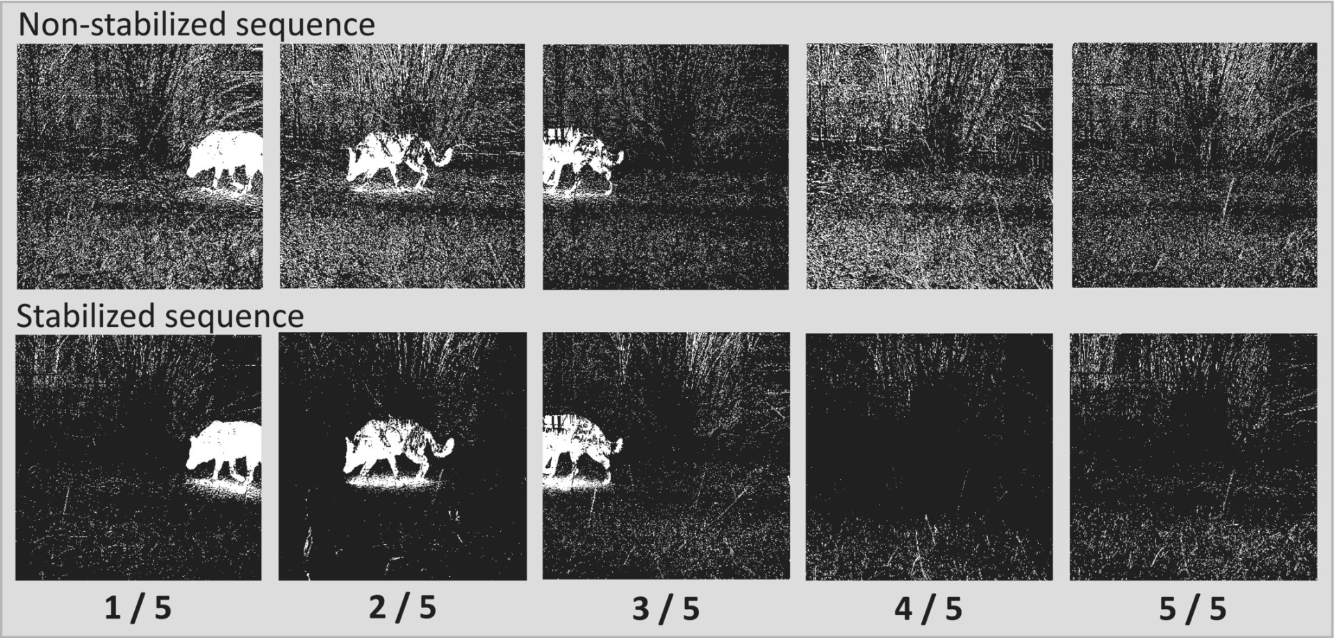 Figure3. An example of a stabilized camera trap sequence during a gust of wind. In the bottom row images, camera movement has been eliminated with algorithmic post-processing. A dog becomes more visible and there are fewer undesired background pixels. Naturally, the movement of vegetation does not disappear completely.