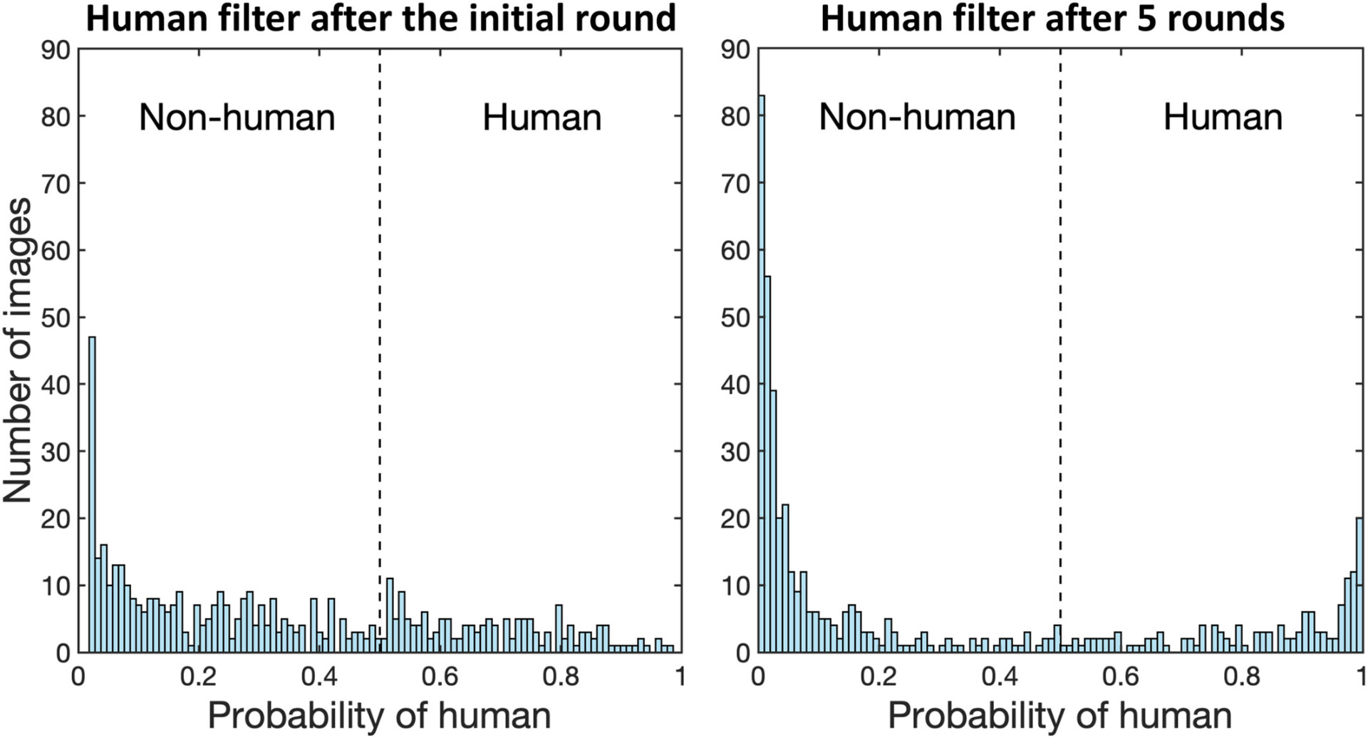 Figure 5. A user can follow the convergence of a filter during active learning from the score histograms of 500 randomly sampled images. Left panel: After the initial 2 × 20 user-selected images (the first round), a filter is fairly unsure about classification, which is reflected by median probabilities far from 0 and 1. Right panel: After five rounds (upsampling; 2 × 192 images) the filter starts to be more confident about classifications, indicated by a reduction in uncertainty. Sampled image sets are different in the two panels.