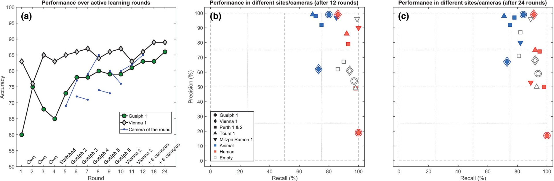 Figure 6. (a) Accuracy in sequence classification improves during the active learning process with two initial training cameras. Blue line segments show accuracy improvements from each new camera used in training—right before and after a training round. The corresponding camera names are marked on the x-axis. Accuracy is still improving between rounds 12 and 24. (b) Shows class-wise precisions and recalls for different cameras from various sites after 12 rounds. Double framed markers correspond to the cameras G1 and V1 of panel A and the legend lists marker shapes (sites) and colour codes (classes). (c) The situation after doubling the training data stays almost the same, except that the precision of the human class has decreased.