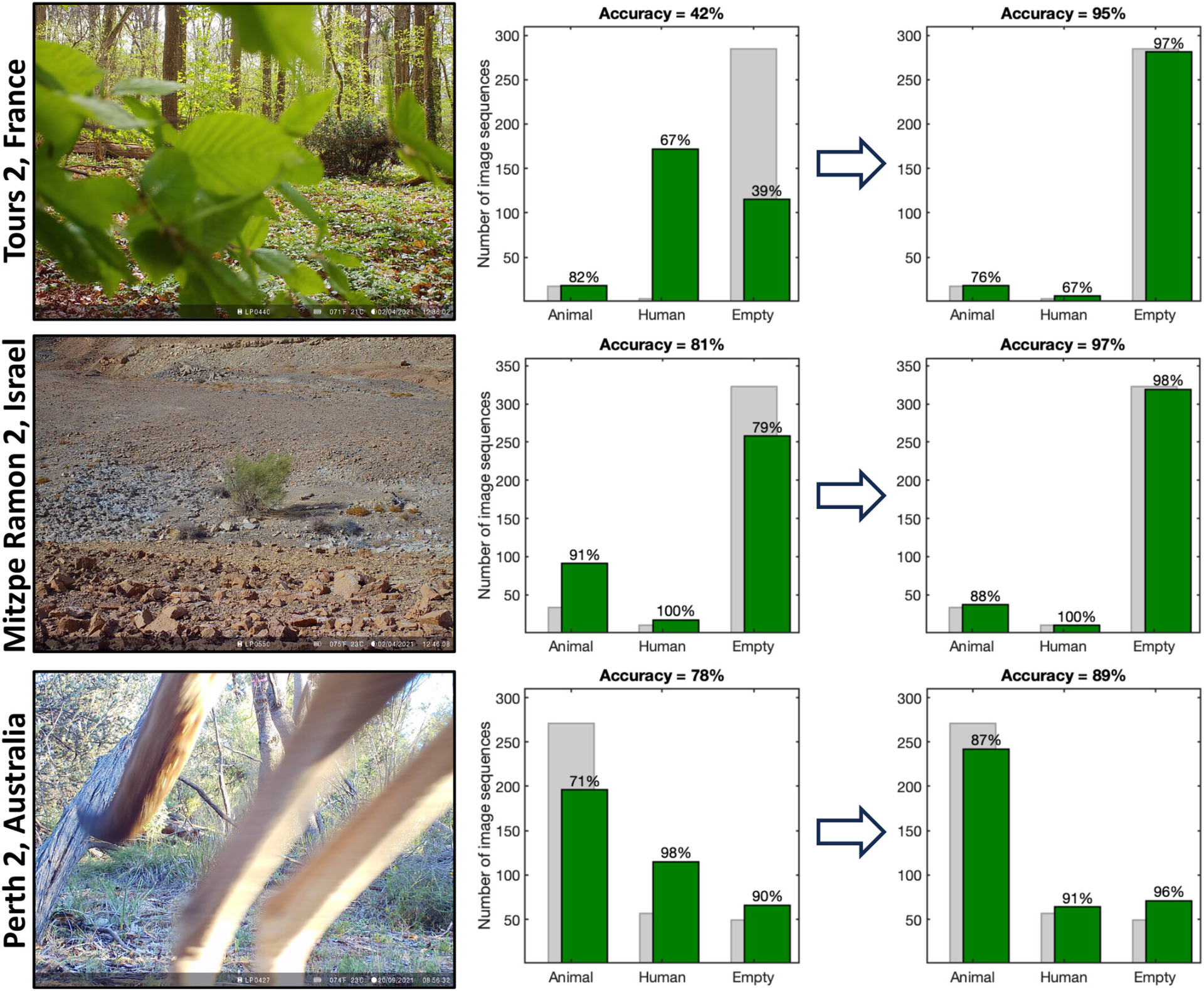 Figure 7. Sequence classification performance improves after additional training rounds on cameras having initially lower accuracy (T2, MR2 and P2). Example images from these cameras are shown in the leftmost column. Grey bars show the true amount of sequences in each class and green bars show classification results. In Tours, the movement of tree leaves is interpreted as possible humans (compare the bars at the top middle panel). In Mitzpe Ramon, the movement of a bush is interpreted incorrectly as animal movement. In Perth, the 12 round classifier interprets some kangaroo images as humans. After the additional training rounds, the performance increases considerably in each case (the rightmost column). Percentages shown are the recalls of each class; that is, what proportion of correct class sequences were found.