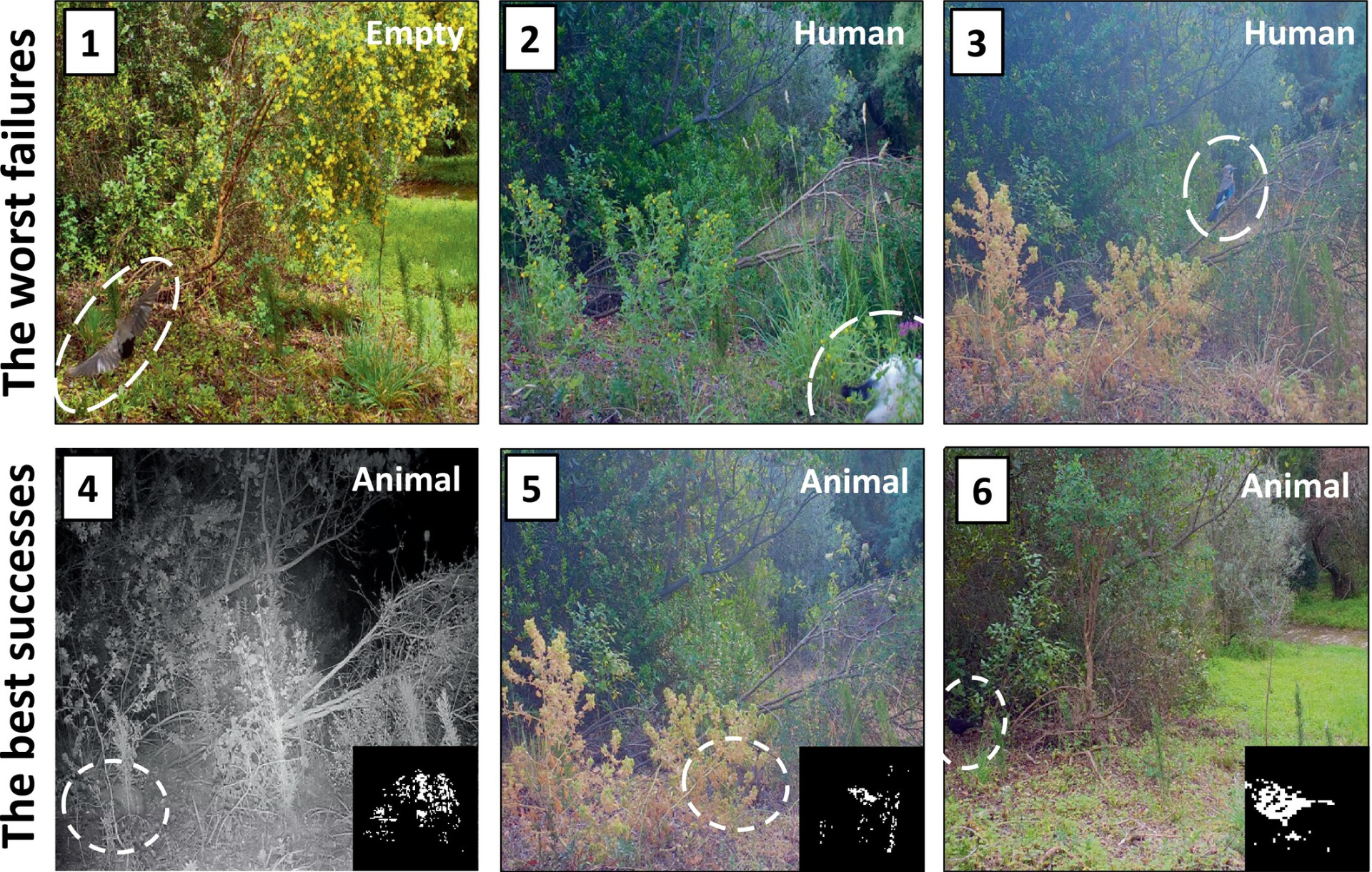 Figure 8. Examples of Lisbon camera classifications. Class predictions are shown in the top right corner of each image. On the top row (images 1–3) are the worst cases where the classifier failed to recognize highly visible animals. On the bottom row (images 4–6) are some of the most cryptic examples that our classifier recognized correctly. Zoomed B&W masks on the bottom right corner of each image show the movement pixels. By raising the human probability threshold to 80%, images 2 and 3 become correctly classified.