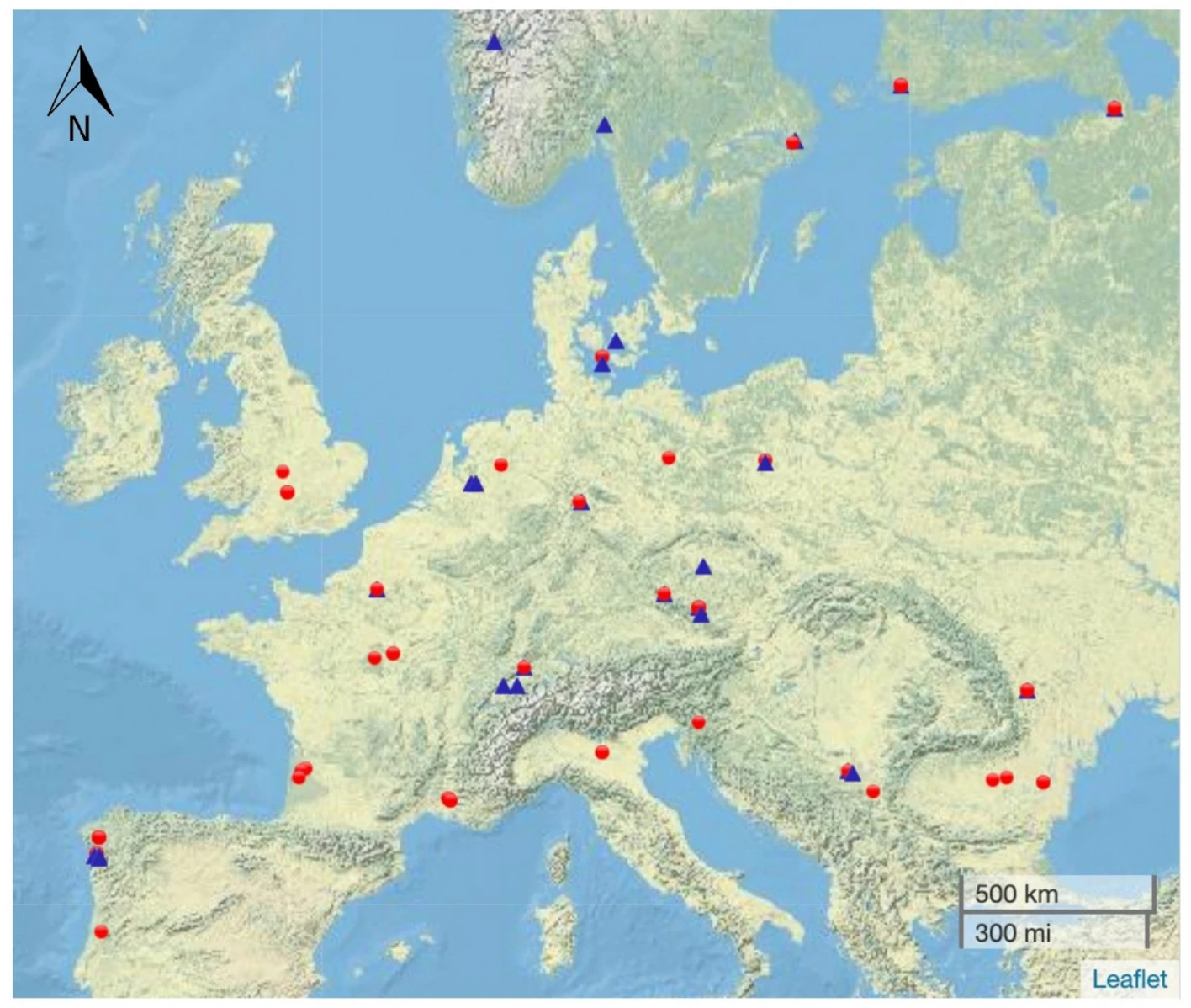 Figure 1. Locations of the trees sampled in 2020 (blue triangles) and 2021 (red circles). The map was produced using Leaflet (Cheng et al. 2021).