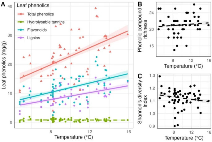 Figure 3. Effects of temperature on leaf phenolics (A: total phenolics, hydrolysable tannins, flavonoids and lignins; B: phenolic compound richness; C: Shannon diversity index). Triangle and circle shapes represent sites and correspond to total phenolics and to each of the three groups of phenolics and diversity index, respectively. Solid lines represent significant model predictions, while dashed lines represent non-significant model predictions in the linear models. Shaded areas correspond to standard errors.