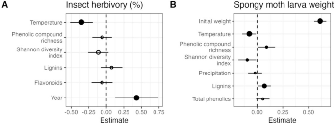 Figure 4. Effects of temperature and/or precipitation, leaf defenses (phenolic compound richness, Shannon diversity index, lignins, flavonoids and/or phenolic concentration), initial weight of the spongy moth larvae (note that initial weight was present only in the model of spongy moth weight) and year A on insect herbivory under natural conditions and B on final spongy moth larval weight under laboratory conditions. Note that only the variables retained in the selection of models are represented. Circles and error bars represent standardised parameter estimates and correspond to 95% confidence intervals (CI), respectively. The vertical dashed line centered on zero represents the null hypothesis. Full and empty circles represent significant and non- significant effect sizes, respectively. Circle size is proportional to the relative variable importance (RVI). The year 2020 is the intercept and was contrasted with the year 2021.