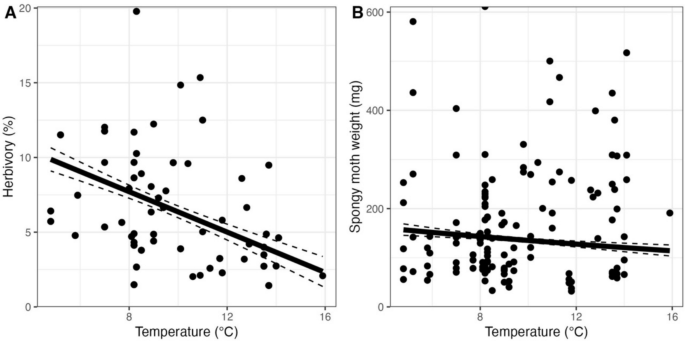 Figure 5. Effect of temperature on herbivory (A) and spongy moth weight (B). Solid and dashed lines represent model predictions and corresponding standard errors, respectively. The dots in panel A represent the average herbivory damage, calculated from 60 leaves analyzed per tree and averaged across each site, while dots in panel B correspond to the spongy moth weight of each larva (with 3 replicates per site). Only statistically significant relationships are show.
