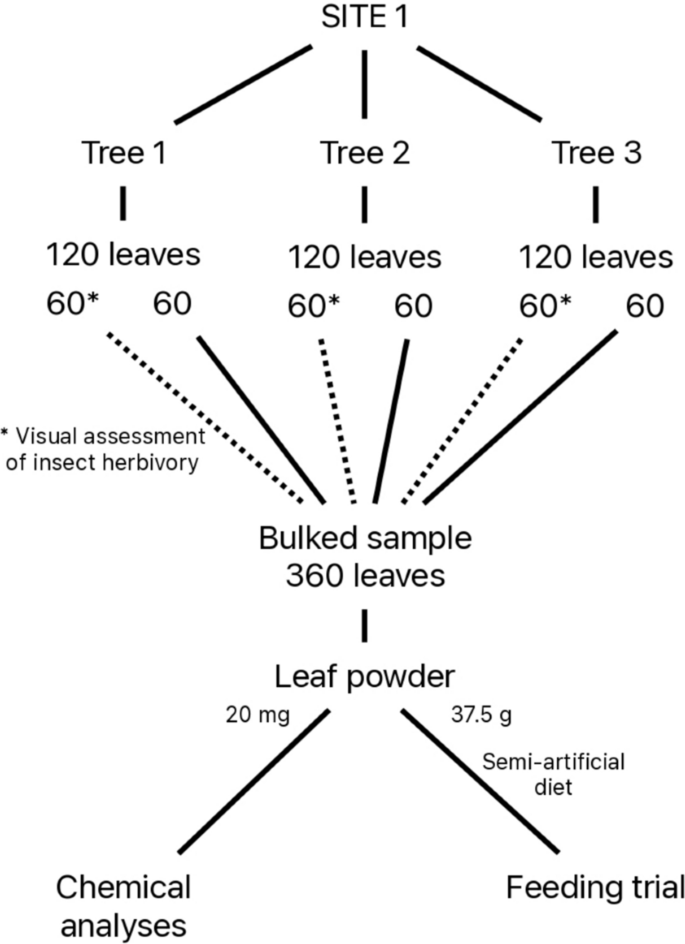 Figure 2. Schematic representation of leaf samples used for the quantification of leaf phenolics (chemical analyses), the assessment of herbivory and the laboratory feeding experiment (feeding trial).