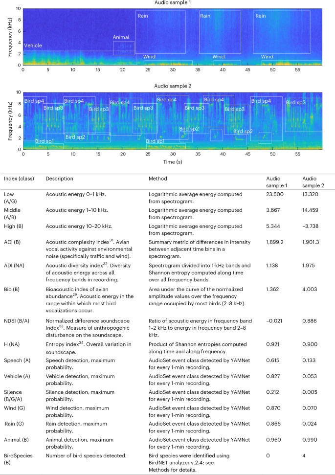 Fig. 1: Acoustic indices used to track the rhythms in the global soundscape. Top: two example spectrograms with the signatures of different sound sources highlighted and identified. Bottom: table lists and briefly defines 15 acoustic indices of the soundscape. In the table and in all subsequent figures, we sort indices by their type (how they are calculated), whereas letters clarify how they are assigned: B, biophony; G, geophony; A, anthropophony; or NA, no clear classification. The values of each index for the example audio clips are given in the last two columns. sp, species.