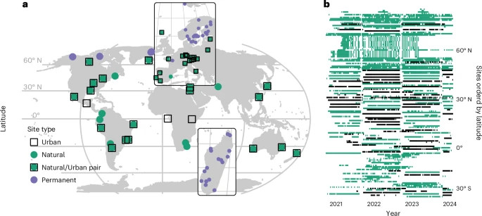 Fig. 2: Sampling design and coverage. a, Across the world, we used up to five AudioMoth31 samplers to record the local soundscape at each of 139 sites. To characterize differences between natural sites (filled green circles) and urban green spaces (open black squares), 83 of the sites were part of a paired design, with each habitat type sampled for a year within a distance of 4–50 km. To avoid the effects of specific years, the starting habitat (natural or urban green space) was randomized between sites. For part of the material (violet symbols), the habitat was fixed to natural sites alone. b, This resulted in multi-annual time series for individual sites (y axis), with the coverage of individual weeks shown by squares across time on the x axis. Habitats are coloured green for natural and black for urban green space.