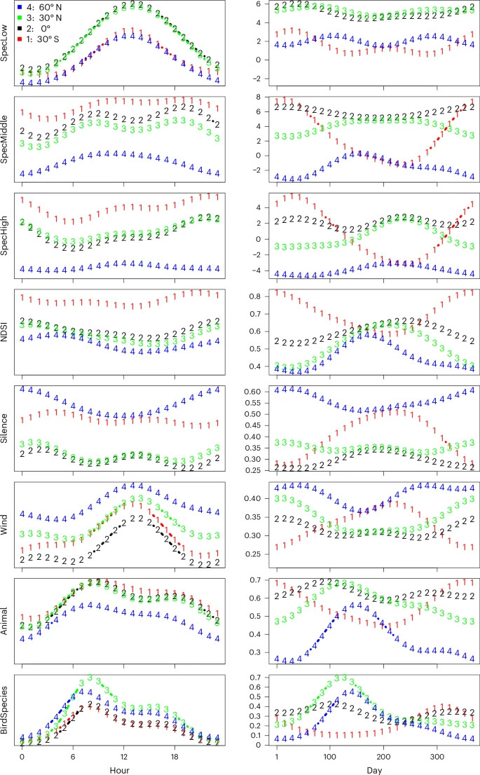 Fig. 3: Seasonal and diurnal variation in different acoustic indices. Predictions for the hour of the day (left) and day of the year (right) for 30° S, 0°, 30° N and 60° N. The predictions shown are based on the global model fitted to all data and shown for those eight indices for which the seasonal and diurnal patterns explained a substantial part of the variation (Fig. 4). Here time is represented by local absolute time; for patterns with respect to time relative to sun time, see Supplementary Fig. 57. Site-specific results for all acoustic indices are shown in Supplementary Information 1. For definitions of each index, see Fig. 1.