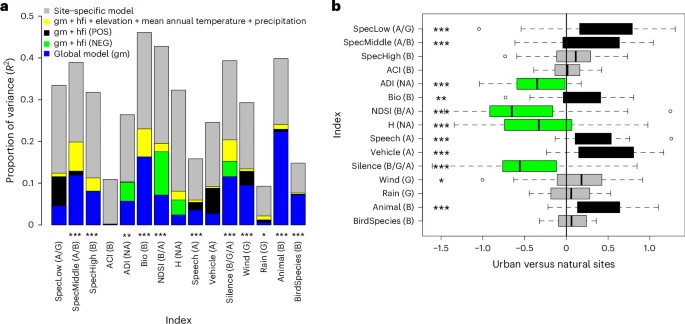 Fig. 4: Predictability of 15 acoustic indices in space and time and differences across pairs of natural versus urban sites. a, Predictability of 15 acoustic indices in space and time. The total height of each bar shows the proportion of variance explained (R2) by site-specific models. The blue section shows variation explained by the latitude of the site using a global model (gm). The significance of latitude was determined by a permutation test (two-sided; 139 sites; 1,000 permutations; no adjustment for multiple comparisons), with index-specific P values as follows: 0.733, 0.001, 0.001, 0.693, 0.003, 0.001, 0.001, 0.359, 0.001, 0.106, 0.001, 0.001, 0.018, 0.001 and 0.001. Significance levels are *P ≤ 0.05, **P ≤ 0.01 and ***P ≤ 0.001. Black (positive effect, POS) and green (negative effect, NEG) sections show the increase in R2 with the addition of the site-specific human footprint index (hfi) to the global model. The yellow sections indicate the increase in R2 when climatic conditions (elevation, mean annual temperature and precipitation) are added to a model including hfi. b, Differences observed across pairs of natural versus urban sites. Each box shows the distribution of empirically observed pairwise differences between the two sites within a pair—with a box for the interquartile range (50% of data), a vertical line for the median; whiskers for the minimum and maximum up to 1.5× interquartile range from the box; and individual data points for outliers beyond this range. Since the difference is calculated as urban minus natural values, a positive value indicates higher values for urban sites (significant differences shown by black boxes) whereas a negative value indicates higher values at natural sites (significant differences shown by green boxes). Index-specific P values from two-sided t-tests across 36 paired values (without adjustments for multiple comparisons): 1.06 × 10−5, 7.91 × 10−4, 1.46 × 10−1, 8.60 × 10−1, 1.89 × 10−7, 3.06 × 10−3, 2.45 × 10−5, 5.71 × 10−4, 9.51 × 10−9, 3.46 × 10−8, 5.41 × 10−6, 2.65 × 10−2, 3.27 × 10−1, 1.10 × 10−6 and 6.07 × 10−2 (with asterisks as in a). Index letters as in Fig. 1. Diel variation was modelled by local absolute time; for patterns with respect to sun time, see Supplementary Fig. 58.