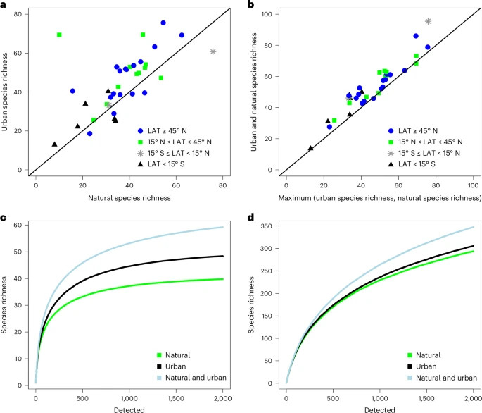 Fig. 5: Species richness for 36 site pairs composed of natural and urban sites. a,b, Species richness for individual urban and natural sites addressing whether urban or natural sites have more species (a) and whether urban and natural sites have different species (b). c,d, Species richness as a function of the number of bird detections sampled separately for each site after which we averaged the resulting curves (c) and in samples from pooled natural and pooled urban sites (d). Green curves emanate from natural sites and black curves from urban green spaces. Light-blue curves are based on data combined across the natural site and its paired urban green space, and thereby represent sampling of recordings irrespective of the environment of origin. The data include bird detections (BirdNET confidence threshold 0.8) for which recordings were available for both urban and natural sites at the same day of the year and the same time of the day within each pair. The resulting data have been sampled with replacement. In a and b, species richness S is defined as the number of distinct species in 1,000 detections, whereas c and d show the accumulation of species richness detected up to 2,000 detections. All results are averages across 50 replicates. LAT, latitude.